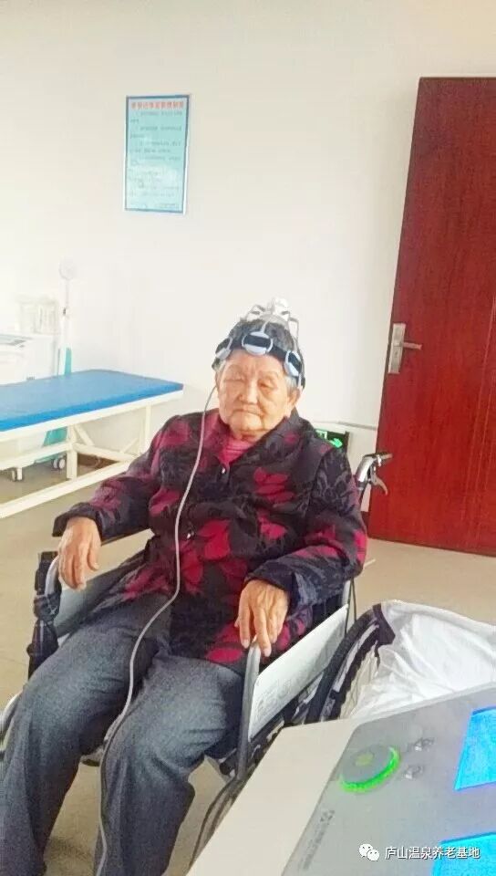 正在为老人做脑电仿生刺激仪,刺激她的脑神经康复,通过磁、振、热达到活血化瘀。